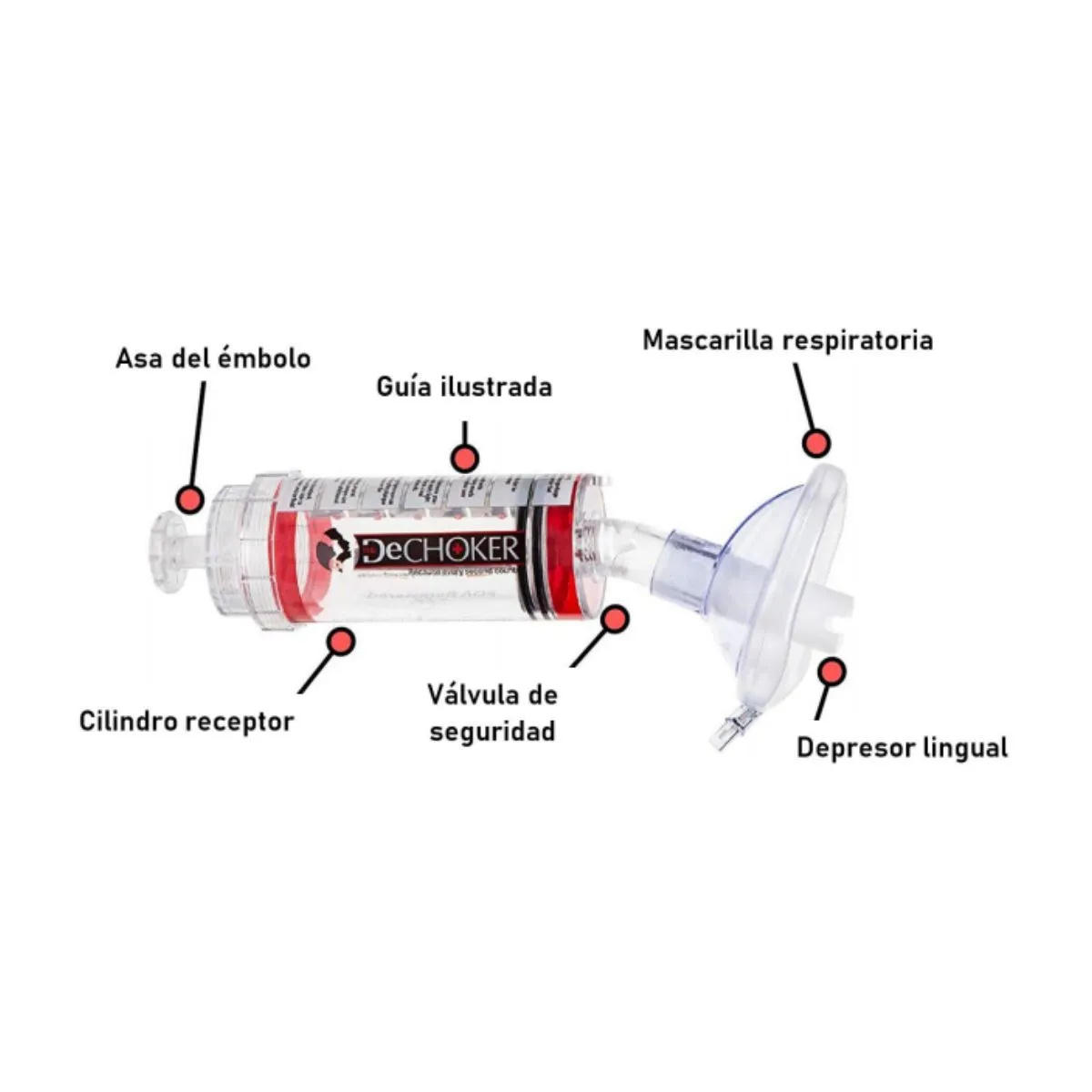 Su funcionamiento se basa en un sistema de succión por presión negativa, que ayuda a extraer alimentos u objetos que bloquean la respiración. Es fácil de usar, incluso sin conocimientos médicos previos, y se puede reutilizar tras una limpieza adecuada.